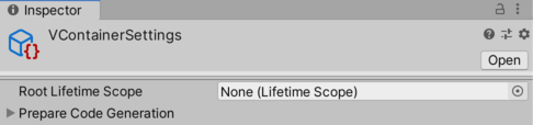 1. VContainerSettings のインスペクタの Root Lifetime Scope へ 、ルートにしたいLifetimeScopeのプレハブを指定します。
